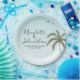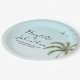 Ces assiettes personnalisées présentent un thème tropical pour une destination ou un simple mariage sur la plage. Une image d'un palmier est représentée à droite, avec une volée d'oiseaux volant au-dessus. Le fond est un dégradé de bleu ciel. Les noms des mariés sont imprimés à gauche dans une police de caractère élégante, suivis de la date et du lieu du mariage.