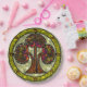 Magnifique et intrigante, la peinture numérique originale qui orne cette plaque de papier est un véritable bijou interculturel ! D'un design traditionnel japonais de nénuphars, l'artiste Leslie Sigal Javorek a créé un riche arbre de vie avec des finitions en bois d'agate et de burl, entouré d'un anneau de feuillage vert en mosaïque parsemé de symboles hébreux pour la "vie" et des David Magen stylisés, le tout contre un arrière - plan qui ressemble à une mosaïque de pierre.
