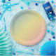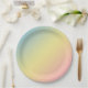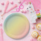 Un arc-en-ciel aux couleurs pastel orne cet ensemble de plaques en papier. Couleurs de rose, vert, bleu, jaune, violet clair, etc. Également disponible en serviettes assorties, et accessoires de cuisine. Idéal pour un pique-nique sur une belle journée.