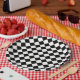 Ensemble de huit plaques de papier de 9" avec une image de Jacquard noir et blanc, un design populaire dans les années 80. Voir la bocal à bonbons, tasse à expresso, flacon, lanceur, théière et dessous de verre correspondants. Voir l'ensemble de la collection Tubular 80s Plate dans le FOOD/BEV | Section Plats.