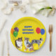 Créez des doggone superbes fournitures personnalisées de fête. Ces plaques en papier présentent des illustrations de style réaliste de chiens bergers australiens ainsi que des ballons colorés de fête contre un arrière - plan jaune vif. Votre message personnalisé apparaît en lettres bleues royales.