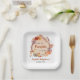 Plaques de papier rustique pour votre baby shower d'automne avec une aquarelle illustrant une couronne composée d'un tronc d'arbre, de mignons animaux de bois (hibou, cerf, écureuil et renard), de fleurs d'automne et de citrouilles. Un "Sweet Little Citrouille Is On His Way" est écrit dans un mélange de typographie simple et d'un script en terre cuite. Précisez le sexe du bébé si vous le souhaitez (p. ex. "est en route").