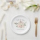 Citrouille d'aquarelle blanche entourée de roses blush avec "Fall in Love" en élégant script en haut de l'assiette et l'espace pour personnaliser les noms ou un message en bas.