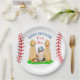De mignons petits garçons et deux chiens jaunes labs avec casquette de baseball, gant de baseball et baseball et chauve-souris assis dans l'herbe ensemble par un terrain de baseball. C'est un thème mignon pour le baby shower d'un garçon au printemps ou en été.