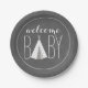 Les plaques à papier de baby shower comportant une illustration d'un teepee blanc de chevron ont incorporé à l'expression "bébé d'accueil." l'arrière - plan est tableau inspiré.