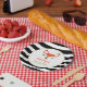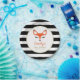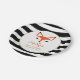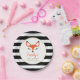 Ces assiettes en papier baby shower moderne et sucrée présentent un visage de renard rouge-orange mignon avec des cils noirs, le nez et les pointes d'oreille. Le nom personnalisable de la future maman apparaît dans la police d'écriture manuscrite orange-rouge correspondante. Au-delà du cadre circulaire en faux or est un arrière - plan de rayures noires et blanches. Idéal pour un baby shower sur le thème du renard ou du bois.