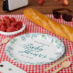 Une jolie et délicate assiette de baby shower avec de délicats feuilles d'eucalyptus à l'aquarelle dans le bleu et le vert doux. L'expression "baby shower" est dans le style calligraphie moderne police turquoise, personnalisée avec le nom de la future mère et date en noir sans serif.