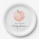 Ces mignonnes plaques de papier baby shower, neutres selon le sexe, présentent une aquarelle orange pastel d'un citrouille, un "baby shower" dans un script gris élégant, et le nom et la date de la douche de la future mère dans un mélange de typographie moderne et manuscrite.