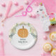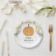 Ces mignonnes plaques de papier baby shower d'automne neutres genre sont ornées de fleurs d'aquarelle blanche, de verdure et de citrouille orange.
