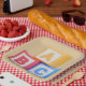 . : Déjeuner Baby shower . : Blocs Alphabet dans les couleurs primaires . : Coordonner les éléments disponibles