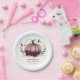 Plaque de papier baby shower rustique et élégante avec un citrouille rose avec des fleurs bordeaux et une parties scintillant en faux or. Customisez ce produit en ajoutant le nom et la date de l'événement de la future mère. Un design d'automne parfait pour une petite fille.