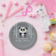 Les plaques à papier de baby shower orienté mignon et doux de panda avec un ours panda de bébé dans des couches-culottes liées avec une couche-culotte goupillent tout en tenant une pousse de bambou verte dans sa main. Il s'assied heureusement au milieu d'une forêt en bambou bleu-clair sur un arrière - plan gris. Customisez-le avec le nom de la maman. © Chrissy H. Studios, LLC d'illustration. Tous droits réservés.