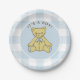 Ces mignonnes assiettes de baby shower sont ornées d'un ours en peluche doux portant un arc bleu. L'Arrière - plan est bleu avec une bordure de buffle bleu et blanc. Texte : "C'est un garçon !"