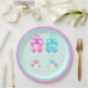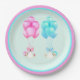 Plaques jumelles créatives en baby shower avec jumeaux garçon et fille sous des bouquets de ballons roses et bleus.