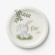 Carte de plaques de papier lapin adorable avec une illustration d'un petit lapin et quelques feuilles verts. Idéal pour les baby showers de garçon et de fille ou les fêtes d'anniversaire. Illustré et dessiné par Patricia Alvarez.
