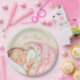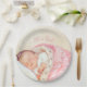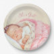 Assiettes en papier pour baby shower vintage filles avec une adorable petite fille endormie enveloppée dans des couvertures douces roses et florales sur un fond doux vintage avec le texte "C'est une fille !". Vous pouvez ajouter du texte dans le style de police de votre choix pour personnaliser, ou supprimer le texte exemple sur ces douces assiettes en papier pour baby shower vintage.