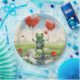 Une grenouille animée joyeuse se dresse sur une roche tenant trois ballons rouges en forme de coeur. La scène est installée dans un champ verdoyant parsemé de tulipes rouges, et un ciel bleu avec des nuages moelleux est suspendu au-dessus.