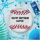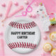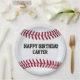 Gros plan extrême d'un baseball blanc avec couture rouge, nom customisé, et heureux texte d'anniversaire. Tout le texte est modifiable.