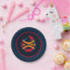 Des jantes Bleues Profondes entourent la plaque avec un arrière - plan Bleu Profond et un graphisme/logo de basket-ball d'art moderne. Taille de 7 pouces et fait de papier pour coordonner pour mixer et faire correspondre. Customiser ou acheter tel quel.