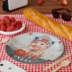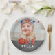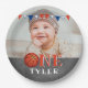 Basketball Ball Chalkboard ONE Photo 1st Birthday Party Plate. Mignonne serviette de fête d'anniversaire pour la 1ère fête d'anniversaire avec une photo personnalisée. Le design est composé d'un ballon de basket et de drapeaux de bunting aux couleurs orange, blanche et bleue. Personnalisez cette serviette de fête d'anniversaire avec la photo et le nom d'un enfant.