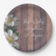 Plaques de papier à l'aspect bois avec roses de plage blancs. Des fleurs réalistes bordent le bord des plaques en papier carré avec une image de panneaux en bois en détresse. A utiliser pour les wedding showers rustiques et les fêtes, ou pour les anniversaires et autres événements décontractés. Choisissez également des assiettes rondes et des bols en papier.