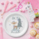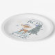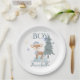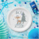 Ces assiettes de baby shower de garçon personnalisées mignonnes présentent une illustration de bois d'hiver de style aquarelle. Une image d'un mâle, ou chevreuil, est imprimée au centre, à côté d'un pin et de la neige bleue tombant.