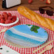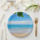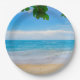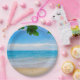 Plaques en papier avec une photo de paysage d'une plage tropicale. Eau d'azur et ciel bleu avec des vagues douces qui lèvent sur le rivage avec quelques nuages au loin.