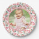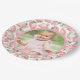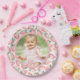 Un Berry mignon et ceinturon premier anniversaire design plaque de papier avec un motif de fraise rose aquarelle avec des feuilles verts autour du bord. Le centre de l'assiette présente une photo de la fille d'anniversaire encadrée par une délicate bordure rose, ajoutant une touche sucrée et personnelle. Ce design est parfait pour une fête de Berry First, apportant un regard amusant et festif à votre table de fête. Idéal pour le printemps, l'été ou toute saison pour fêter votre petit avec un thème charmant et ludique.