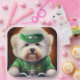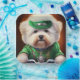Un ami en fureur derrière les guidons d'une moto verte brillante, portant une tenue verte de la Saint Patrick qui fait tourner la tête. Le chien est habillé d'un ensemble festif, avec une cravate arc-en-ciel verte et un chapeau haut assorti qui se trouve doucement au-dessus de la tête. Le costume présente des motifs complexes de shamrocks et de leprechauns, ce qui indique clairement que ce chien est prêt à célébrer la Saint Patrick avec style.