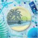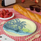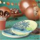 Inspiré par les shorts de plage et les chemises aloha des années soixante, ce motif utilise des bandes d'épingles pour créer le rivage tandis que les surfeurs attendent la pause à Big Sunset sur la Rive Nord d'Oahu. Il y a d'autres objets de décoration dans le même design. Le motif est présenté en plusieurs couleurs. Les serviettes en papier se coordonnent avec les plaques en papier.