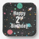 Rocket ships, comets and planets in black outer space for child's 2nd birthday.