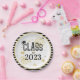 Cette plaque de célébration de graduation en noir et or contient les mots "Classe de" écrits en noir avec des feux d'artifice de couleur dorée. Le bord de l'assiette est recouvert d'un motif rayé noir et blanc.