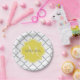 Assiettes en papier motif quatrefeuilles marocain blanc et gris avec un badge jaune que vous pouvez personnaliser en ajoutant votre nom et initiale de monogramme. Cela fait partie de la collection Quatrefeuilles Printemps Coconut Milk et Meadowlark.