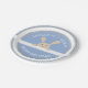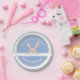 Bleu clair, rond, avec bordure blanche et brune, avec un treillis blanc. Une tête, un visage et des pattes de lapin bronzé se tiennent sur un ruban blanc en dessous. Les textes modèles à droite vous permettent de customiser pour un usage personnel. Idéal pour des fêtes d'anniversaire pour enfants ou un événement de Pâques.