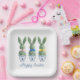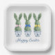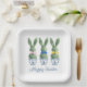 This Easter paper party plate features cute bunny rabbit green topiaries with pink, blue and yellow bows in blue and white chinoiserie flowerpots. Personalize the holiday message with your choice of special text.