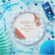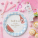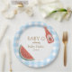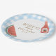 Blue gingham circular baby-q themed baby shower plate