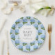 Détail de charme pour n'importe quel baby shower, ces assiettes en papier personnalisé sont dotées d'un motif de jolies fleurs bleues d'hydrangée et d'un texte facile à personnaliser pour un détail de fête qui a le charme doux d'une maison de campagne.