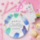 Conçues pour correspondre aux invitations de fête d'anniversaire de nos enfants, ces mignonnes plaques personnalisées en papier sont dotées d'une bordure de popsicles en vert et bleu. "Joyeux anniversaire [nom]" apparaît dans le centre en lettres blanches.