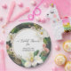 "Assiette en papier pour enterrement de vie de jeune fille motif feuilles florales aquarelle blanc magnolia et rose doré." Parfaite pour un enterrement de vie de jeune fille au printemps ou en été. Des fleurs de magnolia blanc crémeux mélangées à des fleurs sauvages roses et des roses sur des branches et un feuillage vert et brun pour un thème de design naturel et bohème. Une fine bordure dorée scintillante met en valeur le cadre rond qui contient le texte écrit en calligraphie. Œuvre réalisée par l'artiste et designer licenciée internationalement, Audrey Jeanne Roberts, tous droits réservés.