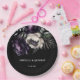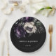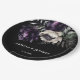 Boho foncé moody élégant gothique personnalisé mariage assiettes modèle, peonies violettes noires sur plaques en papier mariage arrière - plan foncé avec nom de mariée et de marié.