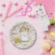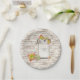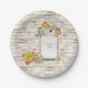 Jolies assiettes en papier avec fond en planches de bois rustique, pot mason et Hens and Chicks. Personnalisez avec vos noms et date.