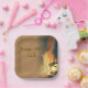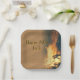 Bonfire birthday paper plates with custom text. A burning fire image with sand background. Sample wording is, "Happy 50th - with name". Choose square or round plates in two sizes.