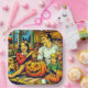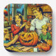 Une mignonne plaque de papier de saison d'Halloween et d'Automne. Scène de bande dessinée d'un citrouille sculpteur familial à la table du dîner.