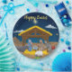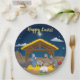 Jolie crèche pour Happy Easter avec un ciel nocturne et un bébé dans la crèche. Assiette en carton.