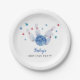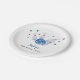 Plate-forme en papier pour la fête d'anniversaire du garçon à thème de bowling mignon illustrant l'aquarelle d'une boule de bowling frappant quelques épingles avec des étoiles bleues et rouges volant.