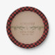 Plaques illustrant deux branches à feuillage persistant. Personnalisez avec des noms. L'Arrière - plan est rouge et noir plaid. Recherchez des invitations de mariage assorties et plus encore chez Jill's Paperie.