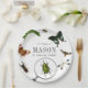 This cute and vintage "we're bugging out" boy's birthday birthday paper plate features a magnifying glass, bugs and insects such as butterflies, a bee, beetle, worm/larva, and dragonfly on a white background. Personalize it for your needs. You can find more matching products at my store.