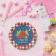 Plaques d'anniversaire de camping avec tente, arbres et arrière - plan rouge plaid.
