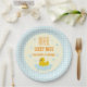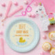 Un canard chanceux ! Premier anniversaire avec canard en caoutchouc et bulles contre un en vichy bleu clair et arrière - plan jaune pâle avec texte orange