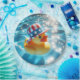 Un canard en caoutchouc jaune décoré de casquette américain flotte sur l'eau pétillante de la piscine